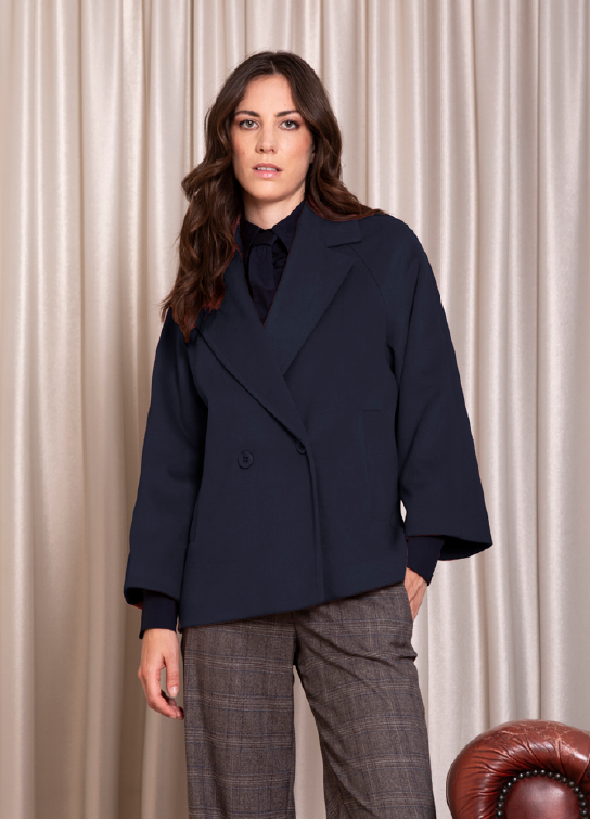 Elegante giacca doppiopetto in blu profondo, con maniche raglan leggermente più lunghe del tre quarti che lasciano scoperto il polso. Linea leggermente a trapezio, lunghezza fino a metà bacino, per un fit sofisticato e raffinato. Perfetta per look chic e contemporanei.